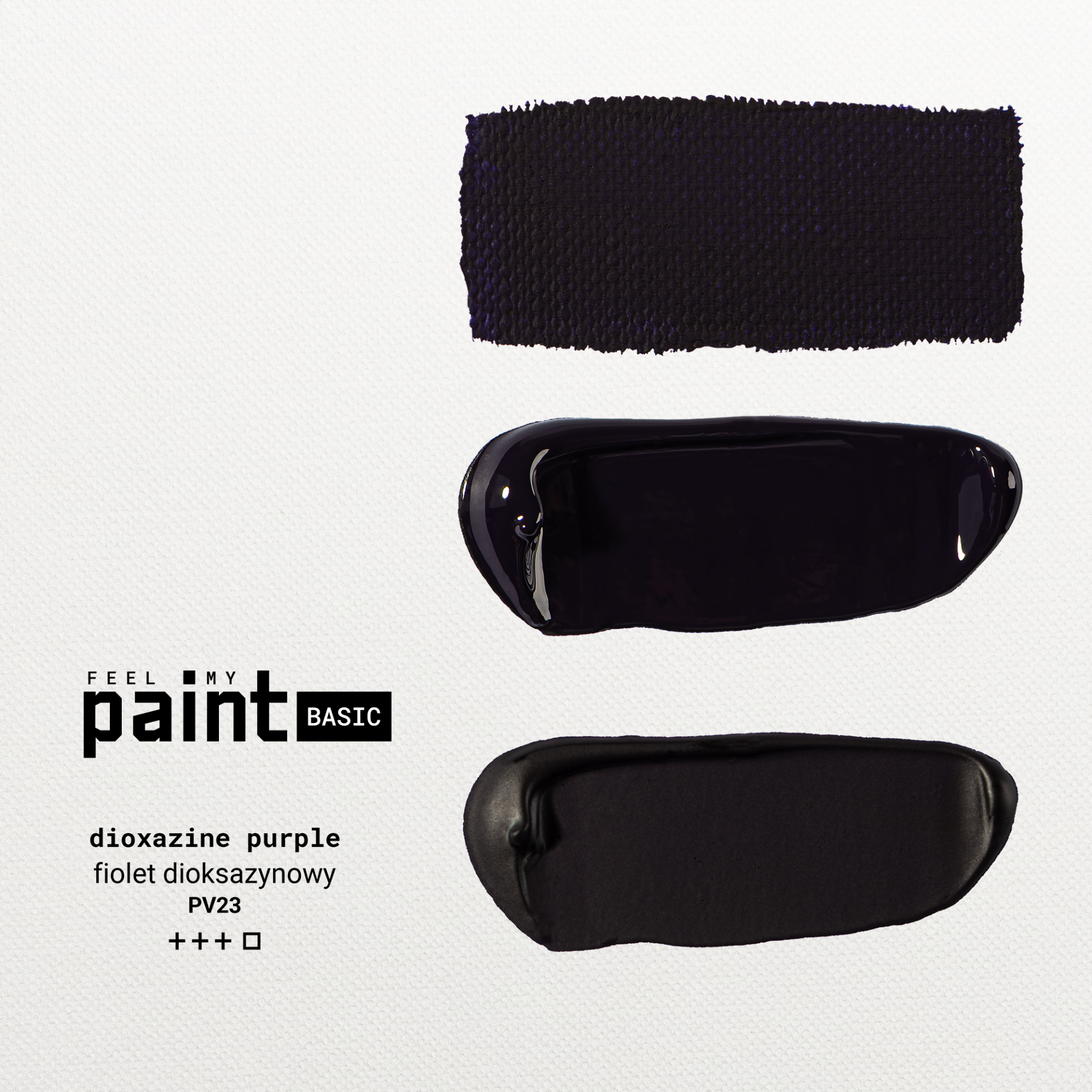 Dioxazine Purple je intenzívny fialový odtieň vytvorený pigmentom dioxazínová fialová (PV23). Vyniká vysokou farebnou hĺbkou a výraznou sýtosťou, vďaka čomu je vhodný na dramatické akcenty, tieňe aj miešanie bohatých farebných tónov. Farba má transparentné krytie, ideálne na lazúrovanie a vrstvenie.