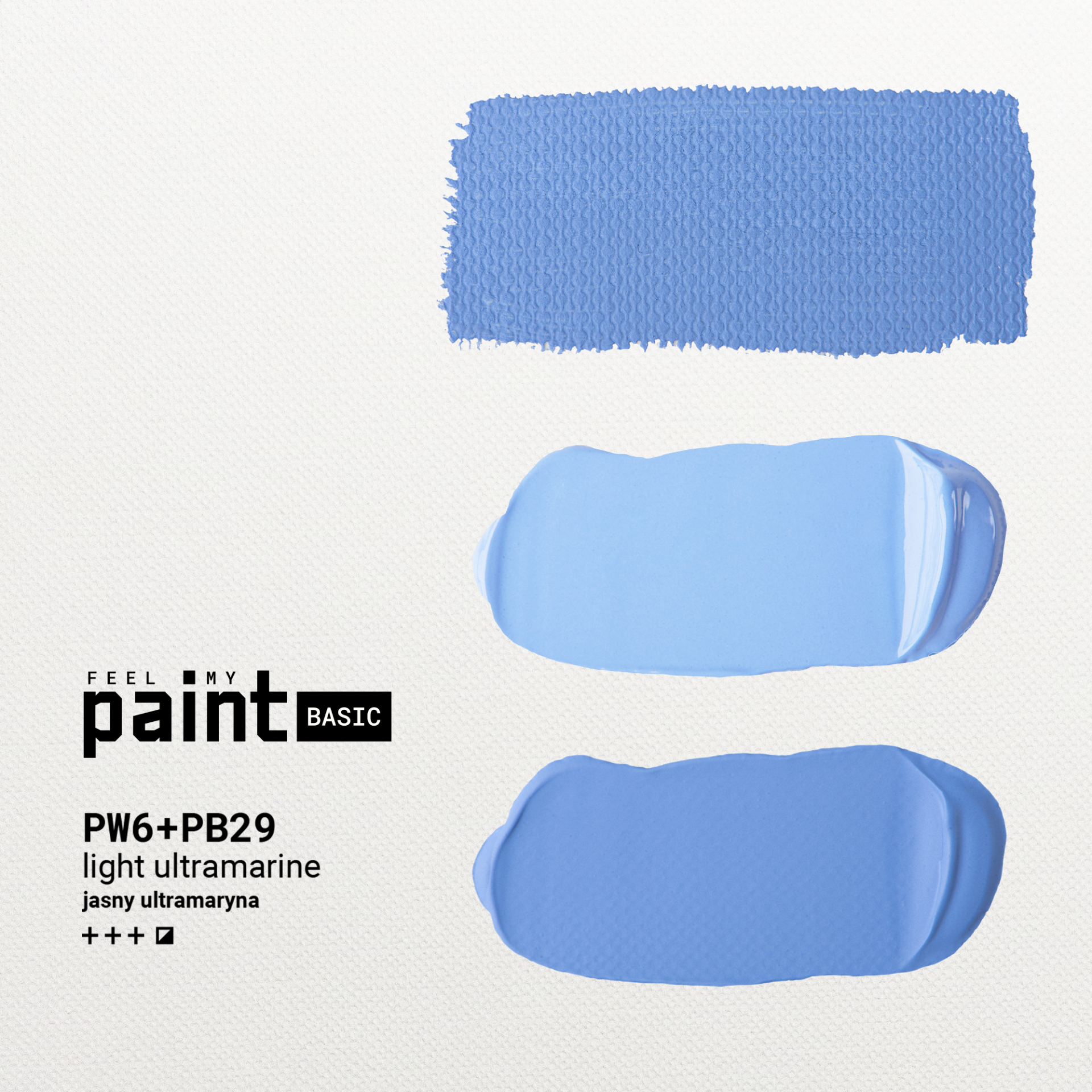 Light Ultramarine je jemný modrý odtieň vzniknutý spojením titánovej bielej (PW6) a ultramarínovej modrej (PB29). Pôsobí ľahko a vzdušne, vhodný na maľbu oblohy, diaľok aj mäkkých farebných prechodov. Farba má polopriehľadné krytie, ktoré umožňuje prirodzené vrstvenie farby.