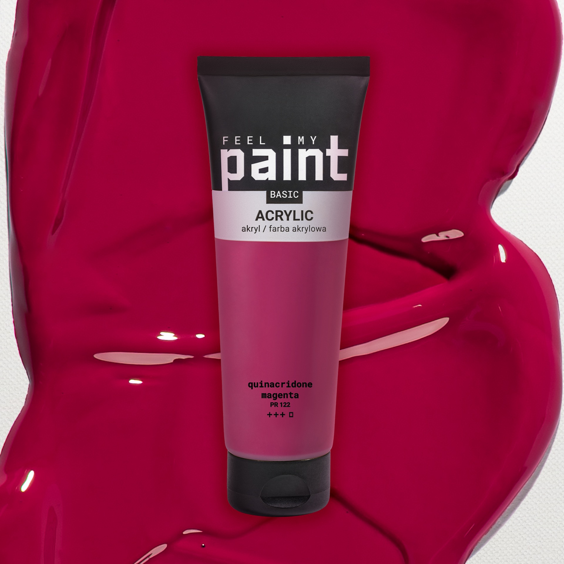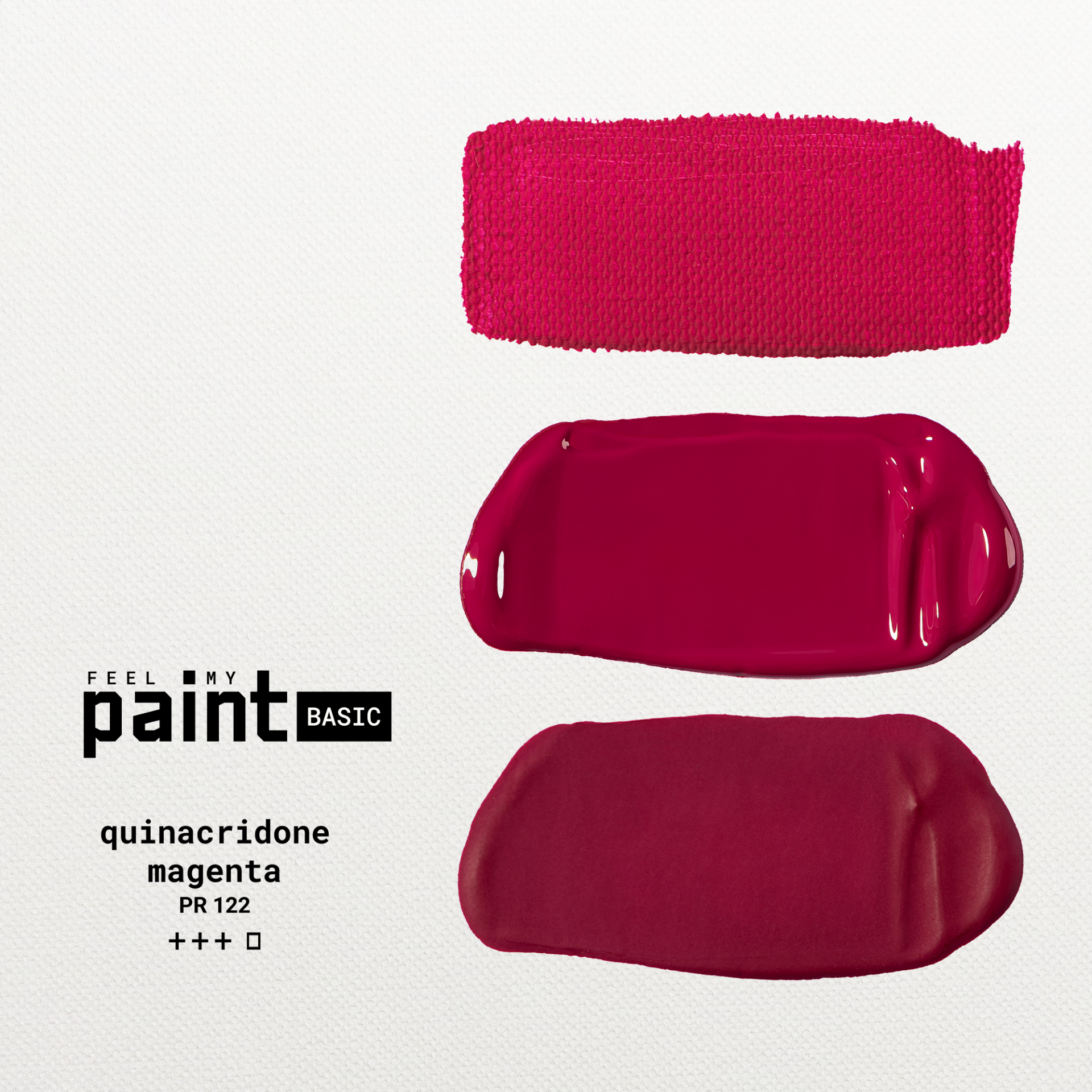 Magenta je výrazný ružovo-červený odtieň vytvorený pigmentom quinacridone magenta (PR122). Vyznačuje sa čistotou tónu a vysokou intenzitou, vhodná na miešanie žiarivých fialových a ružových odtieňov aj na výrazné farebné akcenty. Farba má transparentné krytie, ktoré umožňuje budovanie farebnej hĺbky vo vrstvách.