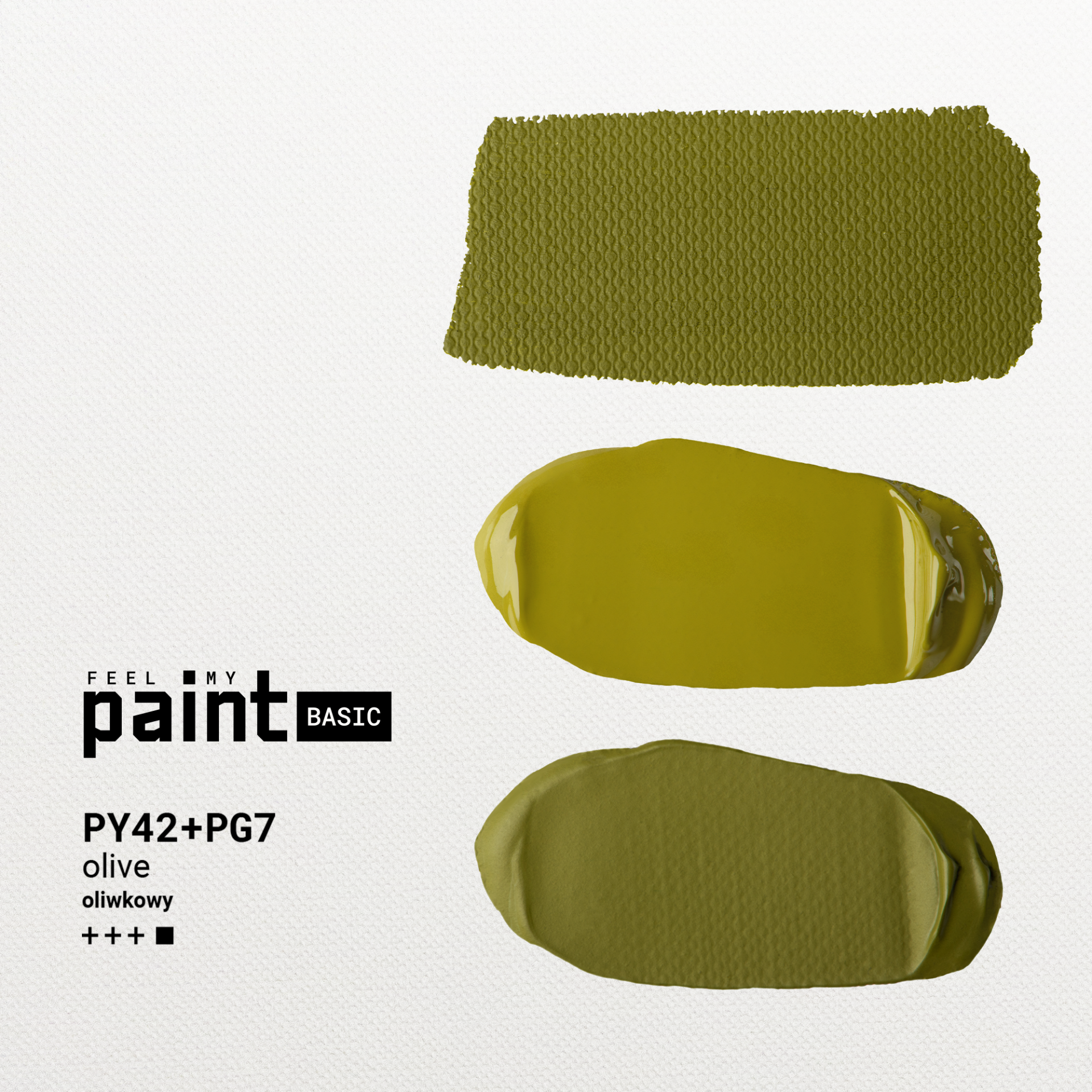 Olive Green je tlmený zelený odtieň vzniknutý kombináciou žltého oxidu železa (PY42) a ftalocyanínovej zelene (PG7). Má prirodzene zemitý charakter, vhodný na krajinomaľbu, vegetáciu aj realistické prírodné motívy. Farba má nepriehľadné krytie, ktoré umožňuje rovnomerné a plné nanesenie.