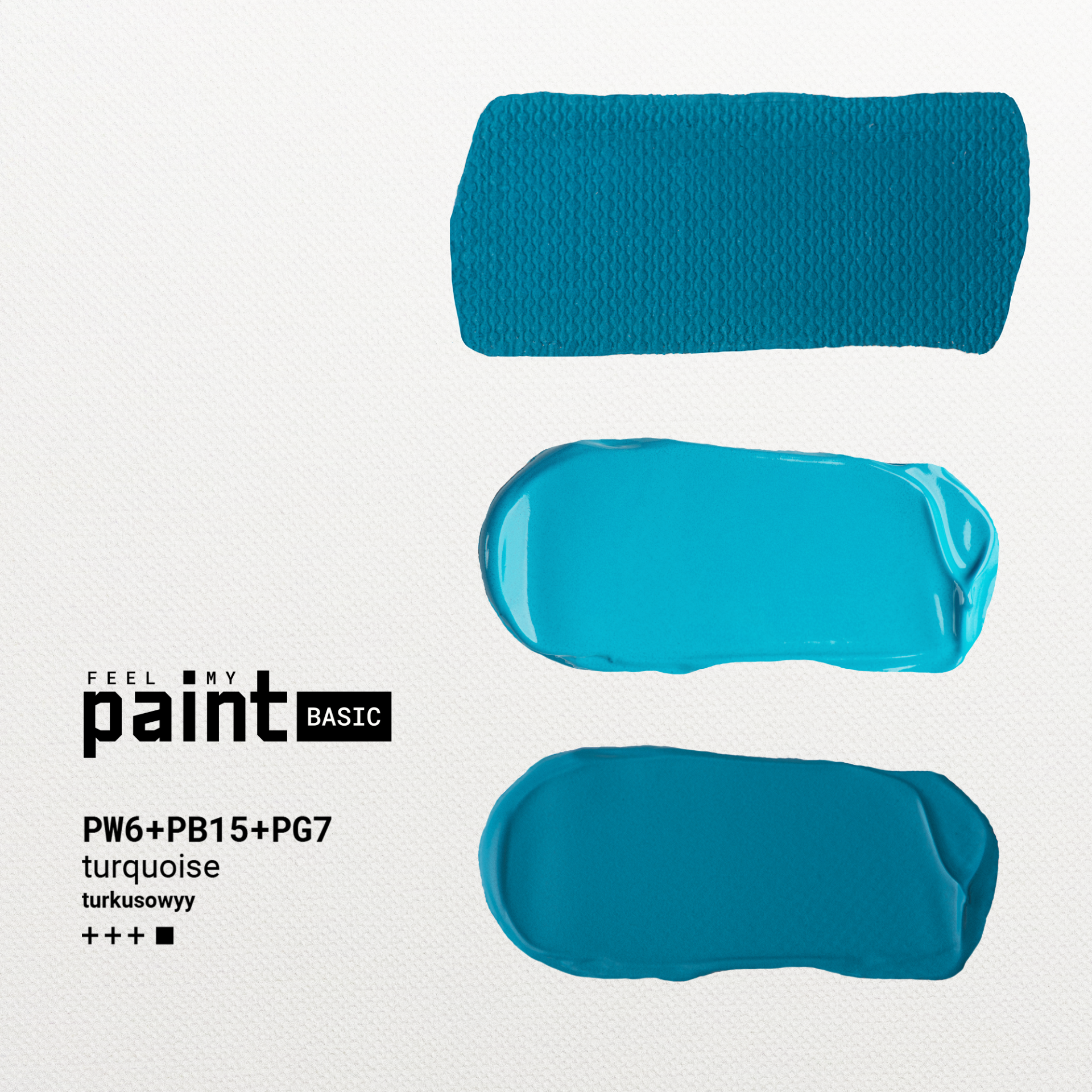 Turquoise je vyvážený tyrkysový odtieň vzniknutý spojením titánovej bielej (PW6), ftalocyanínovej modrej (PB15) a ftalocyanínovej zelene (PG7). Pôsobí sviežo a univerzálne, vhodný na prírodné aj abstraktné motívy. Farba má nepriehľadné krytie, ktoré zabezpečuje čistý a jednotný výsledok.
